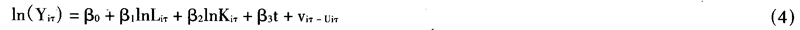 其中,Yiτ代表第i个企业在第T时期的实际产出,xiτ代表一组投入向量和与第i个企业在第,时期观察变量相关的其他解释变量;β为一组待估向量参数;Viτ为随机误差项,被假定服从标准的正态分布 N(0,σ2v),并独立于Uiτ;Uiτ为代表技术非效率的非负值随机变量,被假定具有独立分布的特性,因而服从截尾正态分布N(Ziτδ,σ2u)(在零处);Ziτ是和企业生产技术非效率相关的解释变量,δ为待估参数。